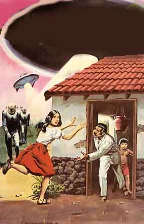 ikke bare tegneserier fra 50tallet -men idag tv og hollywoodfilmer - er fylt med skrekkhistorier om "romfolk" som skal "ta oss" - et effektivt medium for å skremme den uvitende masse om temaet - slik at den skjulte (penge-)makt kan fortsette sitt slaveri av  den uvitende menneskehet. MEN DETTE KUN INTIL DE ÅNDELIG SETT VÅKNER OPP og dette skjer gradvis i denne tiden da mer VÅKNE mennesker inkarnerer her på jorden.