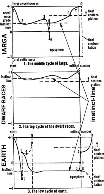 This diagram represents the creation plan of three different kinds of evolutionary development of an unknown total number, and compares the cycle of Iarga with Earth and another upper cycle having a lesser degree of free will in evolution. Earth evolution is among those having the greatest degree of free will operative in its creatures in development.