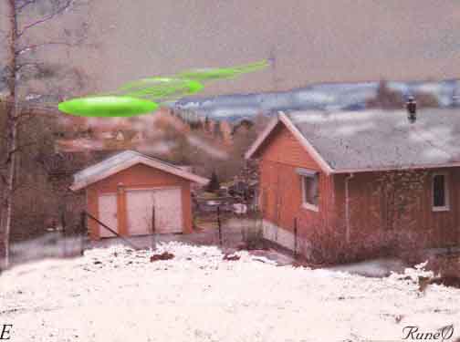 En natt i okt. 95? - våkner Liv av et forferdelig "leven" - og hun tror det er innbrudd i huset. Hun ser så at gangdøren er åpen og at det lyser der - hvilket det slett ikke "skulle". Hun lurte på hvordan tyvene var kommet inn men frykten gikk over til raseri. Ute i gangen så hun at kjellerdøren sto åpen - Liv forsto intet - "for jeg låser jo alltid". Hun hørte samtidig en merkelig summelyd. (Noe tilsvarende er beskrevet i SØREN B.s kontakter - han fikk også uanmeldt besøk på sitt soverom - se link til slutt). Men hun vil ta dem på fersken - går inn i sin stue - og der er alt på plass…..som vanlig. Intet er knust eller brutt opp og ødelagt, men så tenker hun at de må være i kjelleren... Men heller ingen der. Så ringer hun til lensmannen som ber henne se etter spor i nysnøen, det hadde nettopp snødd. Hun ser ut - men ser ingen spor! En betjent ankommer og de ser over hele huset - men intet unaturlig å se. Hadde det ikke vært for at disse dørene sto åpne, samt lysene på - ville hun tro det hele kunne vært en drøm i ettertid, men.... *** Den 12 okt 1997 – ca halv ni på kvelden - ser Liv flere lysende kuler over frostrøken som lå lavt over Randsfjorden, og etter å ha sett på dem en stund ringer hun til en nabo - Wenche Langbråten - som sammen med mannen og andre i huset - så det samme som referert under. Men før hun ringte sier Liv at en av kulene på et øyeblikk suste helt inn til hennes hus slik at hun på helt nært hold kunne se at det faktisk dreide seg om en "ufo" - med vinduer rundt det hele - men litt skuffet kunne hun ikke se noen vesener "der inne". Ja - hun sier hun kunne se gjennom hele skipet og ut på den andre siden gjennom vindusrekken i periferien av skipet…..det var et knallgult lys inne fra skipet (eller gule vegger…) sier Liv og merkelig tynne "vinduslister" mellom vinduene. Hun sier også på intervjuet at hun i ettertid fant ut at den må ha vært i en avstand på 18 meter fra huset. Hun går ut på terrassen og peker der månen sto på det aktuelle tidspunkt og hvor fartøyet var i forhold til noen trær som "den gang var en del mindre enn i dag". bildet er et forsøk på å gjenskape hennes (og to naboers-)opplevelse - her med Liv er ute på terassen og peker mot fartøyene - mens de små lyskulene "svirret" hit og dit med voldsom hastighet - noen ganger nede i tåka over Randsfjorden - og da skinte de i regnbuens farger. De to store var i ro over - men på et tidspunkt fløy det ene lynhurtig og plasserte seg rett utenfor vinduet til Liv - se bildet lenger ned. Da skipet for opp igjen sier hun det virket som et stort hjul og det blinket. Og hun ringte da til en journalist i lokalradioen - RANDSFJORDEN RUNDT (Bjørn Ivar Rudsengen) - som hun hadde lovt å kontakte "neste gang hun så noe" - og han + flere andre der - kunne se objektene. Se under. Tidlig på høsten -97 ble Liv "av noe" inspirert til å fortelle om alle sine merkelige opplevelser på denne lokalradioen og det ble et program på en hel time - som fikk så stor tilbakemelding i ettertid at det ble sendt i reprise senere. bildet: Liv peker og viser hvor nære fartøyet var og beskriver at det var merkelig at hun ikke så noen inne i skipet - bare det sterke gule lyset og de tynne lister mellom vinduene. Et spes. lys på venstre side la hun merke til. Det var dog mye mørkere under "møtet" og også en annen årstid. Bildemix av RuneØ Opplevelsen 4-8-00(som beskrives et sidetrykk lenger nede) var også med sterke LYS inne i den samme have som på bildet over - og noen trær var tydelig misfarvet etter fenomenets nærvær som hun også tok bilder av midt i forfjamselsen. Ja, da jeg besøkte liv for å gjøre dette intervjuet noen uker senere kunne jeg selv se misfargete trær- men kan ikke si de var direkte "brent" - men muligvis "bestrålet". Den 4.august 2000 - ca. kl.20.30 skulle Liv se noe på tv'n - men den virket ikke, og derfor ville hun hente et lite reise-tv på gjesterommet. (senere virket tv'n helt som vanlig). Der inne åpner hun gardinen og ser med ett noen merkelige lys utenfor huset! Det var jo enda ikke mørkt ute på denne tid av året. Først tror hun det er kvelds-solen, men innser at retningen er feil og fargen er jo "en slags stygg gulfarge" på den første lysskiven - flere med andre farger dukker opp etterhvert. Men hun har åndsnærværelse nok til å tenke på å ta noen bilder av lyskulene eller skivene som hun kaller dem - hun har et polaroidkamera liggende og med det tar hun bilder….et av bildene viser faktisk et sterkt lysende "noe". Det kan jo minne om et vanlig motlysbilde - med en "stygg" gulfarge slik hun selv bedømmer det. Senere ringer hun og sier hun har lagt merke til at det det også finnes to mindre "blomkållignende lys" over det området som i ettertiden var nærmest "svidd". Hun har også et annet polaroidbilde er av det lilla objektet som ble sterkt undereksponert av noen årsak hun ikke forstår.… Hun var sterkt oppskaket etter hendelen - noe jeg merket da hun nådde meg på mobiltelefonen noen dager senere. Hun hadde ellers forgjeves forsøkt å ringe mange hun kjente og også sol-observatoriet på Harestua som ligger i nærheten. Ingen hadde sett noe unaturlig denne dagen - så spørsmålet er om det var så lokalt at det faktisk bare "skjedde" rett utenfor som hun beskriver. Etter episoden oppdaget hun at et tre og noen busker var som svidd eller brent og hun ble selv "brent" i huden etter dette møtet forteller hun - ja, selv mener hun at noen av buskene i haven hennes som tydelig er misfarget - er blitt "radioaktive" som hun uttrykker det. Da intervjuet skjedde noen få uker etter hendelsen, var hun enda rød i huden - som hun da selv mener stammer fra dette merkelige møtet denne kvelden….Og buskene/trærne HADDE virkelig en merkelig gul misfarge sammenlignet med de omgivende havebusker.