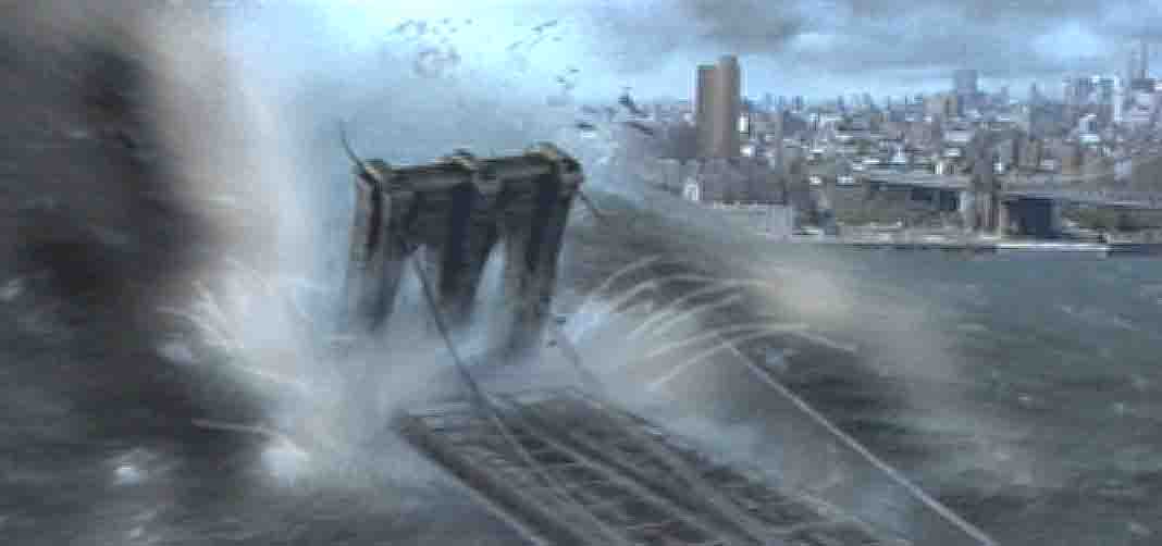 I Middelhavet revnet vulkanen Santorini’s lavavegger helt ned i dypet, og store vannmasser trengte inn. Dette fremkalte en veldig katastrofe, for derigjennom eksploderte vulkanen og ødela øya. Eksplosjonen ble opphav til en gigantisk stormflod, som vokste til 2000 meters høyde, og for frem over havet som et urtidsmonster. Alt på dens vei ble drept og lemlestet, og vannet ble farget blodrødt. I Egypt ble store områder oversvømmet, og alle mulige epidemier oppstod. Flodbølgen raste nå videre mot nordøst mot nåværende Syria og ødela store områder og alle havnebyer.