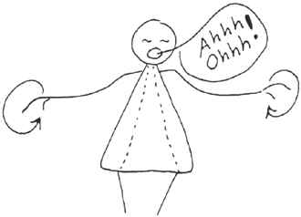 Perform the movement shown in the picture. Stand with the arms stretched out. Move the arms forward in small cirles. Sound the following:"Ahhhh-Ohhhh-Ahhhh-Ohhhh" etc. while you circle your arms (we know, it looks silly to say the least). This makes the aura vibrate and this vibration moves into the body, creating a sort of "slimming-vibration" in the body. Rotate the arms for about 3-5 minutes.