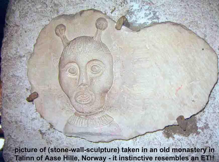 in many of the Rampa books - ex THE HERMIT - it is mentioned ETs with horn-like things on the head, but just this picture may also be on a helmet -like cap on this "ET".      the picture show a girl - just as everybody of us - is having bodies in many dimensions -> begin down on nr.1 picture 3 here is the girl on the mental plane (for example a frequenzy of zz terra-Hz) the white line between the bodies in the diff. planes - is the etheric line - "the silvercord" which connects the physical body to the higher dim.body while "in carno" and up the overself. On this plane - 3-left- she can take other outer forms - controlled directly by the mindforce of the overself where the cord goes to the left...
