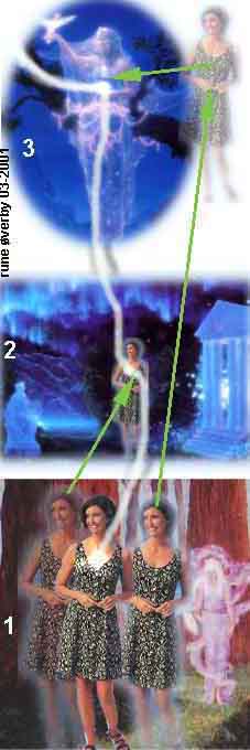 picture 3 here is the girl on the mental plane (for example a frequenzy of zz terra-Hz) the white line between the bodies in the diff. planes - is the etheric line - "the silvercord" which connects the physical body to the higher dim.body while "in carno". On this plane - 3-left- she can take other outer forms - controlled directly by the mindforce. The white line out to the left on picture 3 is the mainline/silvercord to the overself which connects all the different bodylayers and give them real LIFE. picture 2 is the girl on the astral plane -(for example a frequenzy of yy terra-Hz) which she visits when she is deep in her sleep in the night - but can normally not remember anything of this when she awake - because the memory is attached to the physical brain. Dreams are fragments from astralplane adventures.
