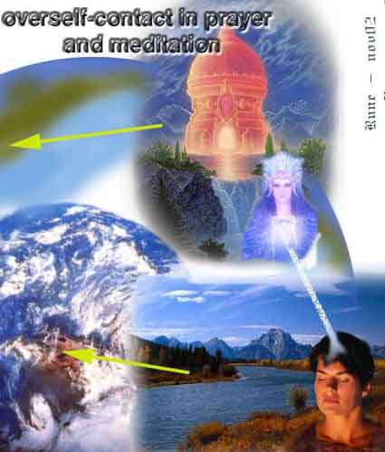 gjennom MEDITASJON og viljesstyrt, konsentrert og bevisst BØNN vil det knyttes kontakt til overselvet eller sjelen som den også kalles - som oppsamler erfaringene som den ytre person gjør i sine jordiske inkarnasjoner gjennom "kosmiske skoleklasser". Dette overselv (X2 jf.Martinus) befinner seg på et høyere plan (som geografisk er rundt jorden i utallige høyfrekvente materieplan) - der den ikke selv kan oppleve lidelser direkte. Derfor må den "skape" og sende ut en "jordisk kropp" for å gjøre såkalte "mørke erfaringer" som er nødvendige kontrast-erfaringer for å opprettholde sansning. Sansning betinger kontraster mellom lys og mørke - behag og ubehag - ubehaget høstes kun i jordiske (grovstoffelige) inkarnasjoner. Jo mer man bruker denne kanal eller "vei" - jo mer vil den styrkes og "utbygges". Overselvet er igjen "koplet opp" til enda høyere plan og som "tilslutt" samler ALT. Slik er vi alle koplet sammen med helheten eller ALTET/GUD. Denne opplever via oss - og da via våre overselver - ALT SOM SKJER OG SKAPES I "SAMTLIGE" PLAN SAMTIDIG!! Via våre overselv er vi allvitende, allmektige og allestedsnærværende - men er normalt helt uten bevissthet om dette her og nå. Merk: DET ER OVERSELVET SOM DU MØTER I ENDEN AV "LYSTUNNELEN" - SLIK DET BESKRIVES I DE MANGE NÆR-DØDEN-FORTELLINGENE. Dette elsker deg - ja alt - uten betingelser, og reflekterer ALTETS grunnprinsipp som nettopp er kjærlighet, forståelse uten krav. Through MEDITATION and conscious, concentrated prayer - a connection to the soul or the overself is made/etablished. The overself collects the experiences the external person makes in the different incarnations through the "cosmic schoolclasses". This overself is on a higher level where pain cannot be experienced. Thats why it has to "create" - through a pair of parents - a body in this heavy material, in the purpose of gathering experiences in "suffering". Those is - seen from the higher levels - necessary in the process of perceiving. The more one uses this "channel" to the overself - the more it will be strengthen and developed. NOTE: IT IS THE OVERSELF THAT MEETS YOU IN THE END OF THE LIGHT-TUNNEL, AS IT IS DESCRIBED IN THE MANY NEAR-DEATH-EXPERIENCES OF TODAY. *more on the higher/overself from