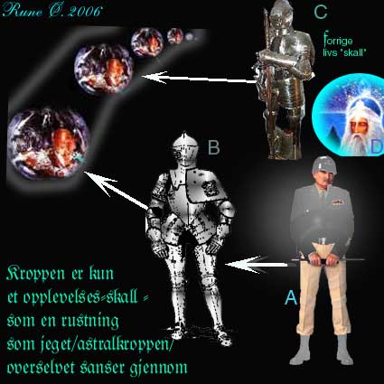 Når "rustningen" ødelegges eller er ubrukbar må A forlate skallet og midlertidig hvile på at frekvensmessig høyere nivå av jorden - inntil A(egentlig D) får lengsel etter en ny kropp/skall"rustning" for slik å høste nye opplevelser/erfaringer for overselvet på D. ALTSÅ: KROPPENE ER KUN MIDLERTIDIGE SKALL SOM JEGET - OVERSELVET/OVERJEGET SANSER OG ERFARER GJENNOM!!