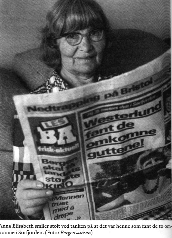 KAMERATENE RUNE OG ARNE HADDE VÆRT BORTE I ET HALVT ÅR. Enorme områder var saumfart - både over og under vann. Så kom Anna Elisabeth Westerlund og «så» en hvit fyrlykt. Olaf Johan og Ingrid Eriksen fikk et svar. «Jeg ser et hvitt spir på et nes, noen tømmerstokker og noen bygninger som er vendt mot sjøen. Like bortenfor neset ligger de, på en hylle på 25 meter dyp. Jeg får en kjøkkenfølelse, jeg tror det ligger et kjøleskap eller en komfyr ved siden av bilen ». Omtrent slik falt ordene da Anna Elisabeth Westerlund satt på lensmannskontoret i Ullensvang en septemberdag i 1980 og la frem sitt syn. Ingrid Instøy Eriksen - mor til Rune - satt storøyd og kjente pulsen stige. Hva foregikk under den mørke panneluggen over bordet? Skulle denne bestemte, konsentrerte kvinnen klare det ingen etterforskere, letemannskaper, manngarder, miniubåter, synske og atter synske hadde klart på et halvt år - bare ved hjelp av tankens kraft? Dag og natt - helt siden 30. mars - hadde Ingrid Instøy Eriksen bare hatt én tanke i hodet: Å få et svar på hva som hadde skjedd med yngstesønnen hun hadde så kjær. Skulle hun nå omsider bli fridd fra uvisshetens kvelende lenker? LENSMANNSBETJENT Eiliv Lønningen i Ullensvang visste om et nes med en hvit fyrlykt like nord for Tyssedal. De dro dit. Ovenfor neset sto et par naust. Noen lyktestolper lå der også, nøyaktig der Westerlund med skjelvende hånd hadde tegnet inn tømmerstokkene. Det hvite fyret står der fortsatt. - De ligger der, sa Anna Elisabeth og pekte ned i den svarte Sørfjorden. Dykkere gikk ned. 26 år gamle Rune Chr. Eriksen og kameraten Arne I. Mala på 21 satt fortsatt fastspent i bilen på hyllen hun hadde beskrevet. Ved siden av bilen lå et kjøleskap. - Jeg er henne evig takknemlig. Hun ga oss en grav å gå til. Det betyr alt, sier Ingrid Instøy Eriksen. MINNER DUKKER opp igjen langs den gamle riksvei 13, som for lengst er erstattet med en ny. Den 87 år gamle trebarnsmoren fra Voss og eldstesønnen Olaf Johan Eriksen vet fortsatt ikke hva som egentlig skjedde den skjebnesvangre dagen da Rune og kameraten kjørte i fjorden. Noen mente det hadde gått et snøras. - Jeg prøver å ikke tenke, sier Ingrid Eriksen, og ser ned den bratte skrenten som stuper rett i fjorden. Flere steder er det spinkle autovernet revet bort. I dag går trafikken i tunnel, like under åstedet. Hun minnes dagen da sønnen ble funnet. Ikke før hadde bilen med følget fra Ullensvang lensmannskontor stanset på åstedet, skimtet hun en kjent gjenstand i veikanten. Det var en reklamefyrstikkeske fra Runes bruktforretning på Voss. Da visste hun. - Det var en enorm lettelse for oss alle. Selv om vi hadde gitt opp håpet om at de skulle bli funnet i live, var det avgjørende for oss å få vite hva som hadde skjedd, sier Olaf Johan Eriksen. Han og moren tror knapt det er mulig for utenforstående å forestille seg hvilket mareritt mennesker som lever i uvisshet og savner sine kjære lever i. - Jeg hadde ikke et øyeblikks fred, sier Ingrid Eriksen. Hun er overbevist om at uten Anna Elisabeth Westerlund, hadde Rune og Arne aldri blitt funnet. « Det var ikke bare døde boplasser og graver jeg fikk innsyn i. Det var som å sette en film i revers. De døde steg opp av gravene og ble levende. Og markene rundt om ble befolket og kledd med telt, jordgammer, stenhus eller hytteliknende trehus. Vår nåtid var borte, fordi den ennå ikke hadde innfunnet seg. » Her ser Anna Elisabeth Westerlund tilbake. Til Tjøllings historie og det gamle Kaupang. Utdraget ovenfor er hentet fra boken hennes, «Telepatiens gåte». Hva var det med Anna Elisabeth Westerlund? Og hva er det med Snåsamannen, og andre som hevder å «se»? Ingen har svaret - ei heller Bente Gullveig Alver, professor i folkloristikk ved Universitetet i Bergen. Hun har skrevet biografien om Westerlund, som lanseres i disse dager. - Vi møter stadig fenomener vi ikke kan forstå, og dem må vi møte med åpenhet. Jeg forstår ikke at dagens forskere på død og liv skal mene at vi har funnet svaret på alt. Hva skal vi forske på om 100 år hvis vi har alle svarene i dag? spør Alver. Hun beskriver Westerlund som en av våre største «kloke» i det 20. århundre. Med det Westerlund selv mente var en fysisk sjette sans, kunne hun se verden fra oven - i fortid, nåtid og fremtid. Hun kunne se tvers gjennom fjellet og langt under havbunnen. Men hun var også et sårbart hverdagsmenneske som levde alene i en bitte liten leilighet i Oslo, hvor hun drakk sin kaffe og spiste sin brunost. Hun giftet seg aldri - fikk aldri barn. Hun mente at det å praktisere som synsk ikke ga tid og rom for familieliv. - Å være synsk eller klok kan oppfattes som uhyre spennende og interessant sett utenfra, men de kloke selv forteller at det er en tung bør å bære. De «ser» så skremmende ting. Slike mennesker møter også mye skepsis. For Anna Elisabeth var det å bruke synskheten et kall. Det var uhyre viktig for henne å bli respektert for den hjelpen hun forsøkte å gi, sier Alver. HUN VAR TETT på Anna Elisabeth Westerlund fra de møttes første gang i 1971 til Westerlunds død i 1995. Først og fremst som forsker, men etter hvert også som venn. Da den synske kvinnen døde, overlot hun all skriftlig dokumentasjon til Alver: 16 kartonger fulle av brev, papirer og bilder, samt hundrevis av avis-artikler. I tillegg hadde Alver sine egne notater og time ut og time inn med lydopptak. - Materialet som er samlet om denne kvinnen, er helt unikt. Kanskje kan det bidra til å gi svar om synske og synskhet i fremtiden - svar på det vi i dag ikke forstår og ikke kan forklare, sier Alver. Det skulle gå 14 år fra Westerlunds død til boken var ferdig. - Det var et enormt materiale jeg skulle gå igjennom. I tillegg hadde jeg full jobb. Men det er ikke hele sannheten. Jeg hadde vært så tett på Anna Elisabeth Westerlund at jeg trengte avstand til henne. Jeg gruet meg litt til å ta fatt, sier Alver. «Jeg ser