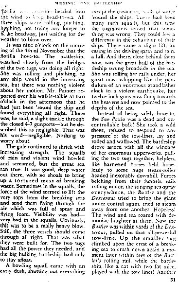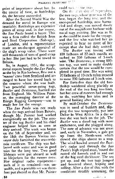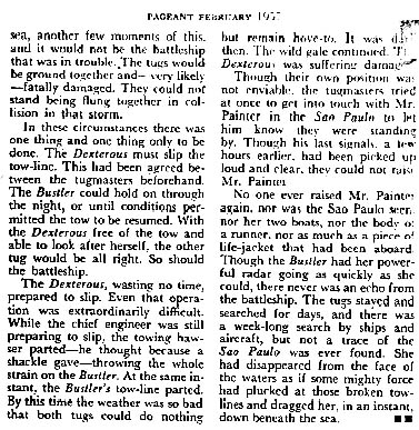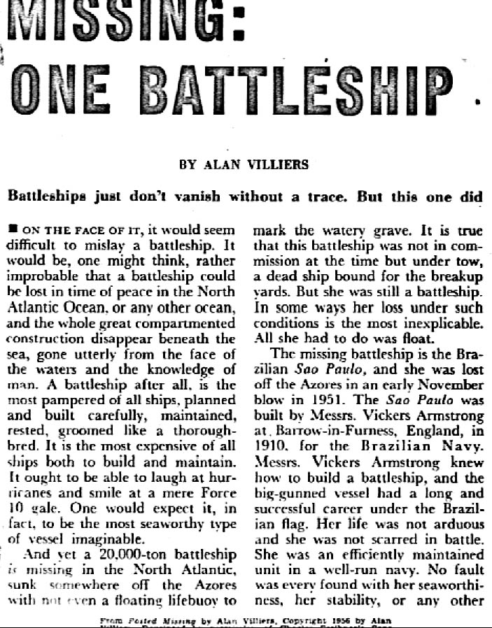 Sure enough, after rummaging quickly through the piles of books, I  came across a February, 1957 issue of PAGEANT magazine, just what I was instructed to look for. In it, I found a reprint article entitled, “MISSING – ONE BATTLESHIP”. Here was the story of the mysterious disappearance of the Brazilian battleship, Sao Paulo, as related by the crews of the tugboats. I read it hurriedly: It was just as my space friend said it was, at least the part that was apparent to the people who did the investigation of the disappearance. They could only be objective, bur I know the REAL story, and an incredible one at that! I have included the article forthcoming in this book so everyone may see for themselves.