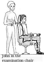 CHAPTER SEVEN John Examined WHEN THE FAMILY separated after the speech of welcome on the balcony, John was taken along a short corridor to an examination room, similar in functional arrangement to the room Frances was taken to, but different in shape and detail. The officer who accompanied him was the same one who later showed John round the ship, and is almost certainly the one who made the welcoming speech. He told John his name was Anouxia (pronounced 'Anno-Youksia'); he spelt his name out for John in the same way as Uxiaulia did for Frances, in a series of letters seen in the mind. Anouxia is clearly of responsible rank; and we would be inclined to call him 'Captain': but Uxiaulia told Frances that no one was in complete charge of the ship, which was run mainly by a computer. Anouxia left John in the medical room, saying that he should wait there until someone came to do his medical examination; in fact John was left alone in the room for several minutes, and occupied his time, quite naturally, prowling (luske omkring) and having a good look at his surroundings. The shape of the room, as he describes it, is peculiar: the central feature is a black-upholstered 'dentist's chair' similar to that used by Frances; but the wall are as shown in the plan. There are two entrances to the room: one behind the chair, through which John entered, and another in front of a person sitting in the chair, not directly in front but somewhat to the right. This was not just a doorway, but a spout-shaped passage curving away to the right, with circular portholes, each about twelve inches across, on its left hand side. Directly in front of the chair, but about twenty feet away from it, is a section of straight wall, without portholes, to which an instrument panel is attached. The panel extends from about head height to about table height; it projects a little from the wall, no doubt to allow space for components and circuitry. Laterally, the panel is five or six feet in length; directly in front of the panel is a desk or cabinet, of the same length as the panel and parallel to it; there is a space between the desk and the panel sufficient for a couple of people to stand and work conveniently; and the floor of this space is raised by a step to form a dais or platform, so that a person standing behind the desk appears a little taller. The desk has a sloping top, the lower side being towards the instrument panel and away from the chair; there are instruments on the sloping surface generally similar to those on the wall panel, which carries a variety of knobs, switches, controls, meters and little coloured domes that light up. The height of the desk is such that it forms a convenient working surface for a not very tall person who stands on the platform, facing into the room. There are no instruments on the vertical front of the desk, facing the chair. Presently, two silver-clad persons came in; they were about five foot three inches in height, and of slight build. Although he did not immediately realise it, John later became aware that they were young women, very slim and small-waisted, with little breast shape as far as their silver uniforms showed. John said their skins were very smooth and fair; he thought they were quite young. Only the faces could be seen: in common with many of the spaceship people of either sex, their silver uniforms continued over the head as a 'balaclava' helmet, coming up under the chin, and extended over the ears as a thin ear-shaped silver skin, fitting the living ear closely; so that their ears looked slightly larger than normal, but silvery. One assumes there must have been an opening, because these people heard perfectly well. One of the two women went straight over to the desk and began operating the controls; she did not at any time speak to John, only smiled at him; he concluded that probably she spoke no English. The other one dealt with John personally and worked around him; he saw her quite close, and says that she was "most attractive, really beautiful, with a flawless skin". She spoke to him; apparently she already knew his name. She made him try to say her name, and that of her colleague, after her; there was much laughter over John's attempts to pronounce them. Her voice was contralto in pitch. The nearest he could get to her name was Serkilias (my spelling, pronounced as 'Sir-Keelious' with the second syllable stressed). She nodded and smiled when he got near enough to satisfy her. She told him that her colleague's name was Cosentia, the second syllable stressed. Serkilias said: "Sit down in this chair; we wish to examine you, to see how alike we are: to see if we can adapt". At the time, John did not understand what she meant; the significance of her remark became clearer when Frances reported her conversation with Uxiaulia, and we knew of the Janos people's desire to settle permanently on the Earth. John sat down as he was told: Serkilias pulled back his shirt-sleeves to expose his wrists (it was a warm night, and he was not wearing a jacket); and she made sure that his wrists were in exactly the right position on the armrests of the chair. Although he did not see her put them on, he found later that each wrist was secured to the armrest by a flexible band, about four to five inches long, so that his arms were gripped securely but not too tightly. His left hand was in a prone position, palm down; but the right hand was secured in such a way that the palm faced to his right, thumb down - an uncomfortable position, just short of painful. John said: "Another half inch of turning would have hurt. One must assume that the purpose of this was to make contact with electrodes let into the armrests. He also says that he found his legs were secured, the knees and ankles being bound together, so that movement was impossible. He had the impression, however, that this was merely a matter of holding him still; he says that Serkilias did not seem nearly so concerned about his leg f