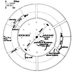 Earlier he had noticed that the numerous columns supported a circular deck, less in diameter than the circle which included the balconies, the deck surface being made up of long panels of perforated metal, about four feet wide, arranged radially in a six-rayed pattern. The panels were cut to shape towards the centre, so that they all lay in one plane; he presumed there was a structural framework to hold the whole thing together, but could not make it out. Because of the perforations, he could to some extent see through the upper deck from below; he could make out some white cabinets similar to the ones on the main deck, but with an important difference - a great many pipes, mostly thin but some of them very thick, extended from cabinet to cabinet, forming a spaghetti-like maze, so dense that he had been unable to see right through them to the final ceiling above. The thick pipes were similar to those he had seen running vertically, close by the columns, joining the cabinets on the main deck to those on the rotor deck above; but the numerous thin pipes, about an inch in diameter, ran from one cabinet to another on the rotor deck only - there were none on the main deck. When he first looked up through the outer part of the perforated rotor deck, before the cylinders of the rotor began to sweep around, there had been some half-dozen or so technicians working up there; but when the rotor began to turn, he had noticed that they left the area in something of a hurry. John had also seen that the perimeter of the upper deck, what we came to think of as the rotor deck, was enclosed by a thick circular wall of a dull grey colour - this is noteworthy as one of the few exceptions to the ubiquitous white or silvery surfaces of almost everything in the spaceship. At six points, equally spaced round the circle, the grey wall was interrupted by a gap of about the width of a normal doorway, which gave access to the rotor deck itself: extending radially outward from each of the six gaps was a catwalk of the same perforated metal - just a single four-foot-wide strip, bridging the space between the wall-gap and a doorway in the outer wall. To be more precise, although he did not realise it at the time, a design analysis shows that four of the six catwalks extended right out to the outer wall of the engine room, but two of them, forming an opposite pair, ran across to meet the somewhat nearer wall segments behind the balconies. Anouxia now took John back up the moving ramp to the balcony again; they passed through a doorway in the back of the balcony, and he found himself back in the dark lift. This time they floated upwards: not very far; and they came out on the same wall that was behind the balcony, but higher up, still within the great circular room. Now they were on a level with the rotor deck, and Anouxia walked out without hesitation along the catwalk, although it had no handrail, and there was nothing to stop one from falling to the main deck, some twenty feet below. John followed Anouxia along the catwalk to the gap in the grey wall, which they passed through on to the rotor deck itself, with its white cabinets and the maze of white piping connecting them. The piping was low down near the perforated deck; and now he realised that the cabinets were lower than those on the main deck, being only about two feet high, though their other measurements were similar. The giant rotor was now still; and he was able to examine it closely. In fact, Anouxia told him, no one was allowed to be on this deck while the rotor was turning: it was too dangerous. The beam which carried the bright cylinders on its outer ends was well above John's head; its lower face was nearly eight feet clear above the deck on which he stood. The beam was sixteen inches wide; its edges were rounded, and the upper surface sloped gently up towards the middle from each side. This sectional shape would give some stiffness without impairing the transverse streamlining, so important when the rotor is turning at really high speeds; it would, I think, also give a slight aerodynamic lift to the rotating rotor beam, which was about 36 feet (11m)in overall length.At each end, the beam was inserted laterally (innsatt i siden) into the centre of the cylinder; each cylinder was about five feet - 1,5m - long, and about 18 inches - 0,46m - in diameter in the middle straight-sided portion. This cylindrical portion was about 27 inches - ca,70cm - long; beyond that, the shape smoothly tapered off like a blunt-nosed bullet, with well-rounded ends, not pointed.(spiss) The maze (labyrint) of pipework made it difficult to approach the centre of the rotor deck; but John could see plainly the central pivot about which the rotor beam turned: it consisted of a vertical shaft, about 18 to 20 inches -50cm- in thickness, extending from floor to ceiling, being secured top and bottom in a massive bearing. A comparably massive collar(flens-krage), mounted on the shaft near its upper bearing, provided secure anchorage for the beam. My calculations suggest that this collar occupies the geometrical centre of the ship. The ultimate ceiling of the engine room was about ten feet -3m- above the rotor deck; so the overall height of the engine room was about thirty feet-9m. The thick grey wall, through which they passed, was about six feet -1,8m-high; it did not extend all the way to the ceiling. Anouxia told John that the grey wall was not merely a wall, but was part of the electrical mechanism. Possibly it is a great circular magnet; but this is my own idea: it was not reported by John. This ended John's conducted tour of the engine room or power complex of the ship; we calculated that it must occupy more than half the total volume of the spaceship, within a circle 150 feet -50m-in diameter. Above it, we thought, there must be three decks, probably not more, containing the smaller rooms, some of which our witnesses have spent some time in, though we did not find it possible to