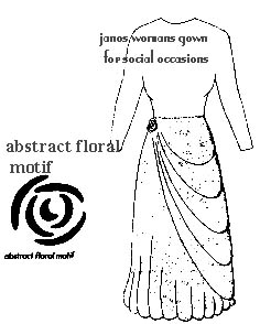 In the flim of the lakeside evening barbecue party, clothing was of three kinds. Some of the men, including the one operating the barbecue, wore only a pair of dark-coloured swim-trunks, similar to those familiar to us. Other men wore an overall suit something like a track-suit, with a broad belt at the waist. In one example, there were white stripes down the outer edges of sleeves, body and legs. In a boat with a mixed crew, both the man and the woman wore a red track-suit; evidently this was considered more convenient for activity than the garments I am about to describe.The women who strolled or sat on the lake shore with their companions were more fashionably dressed. All wore variations on a common theme: this was basically a long-sleeved bodice with a high round neckline, worn with an almost ground-length full skirt, draped in overlapping folds down the left side. The whole thing was held together by a large round metallic-looking clasp, of an abstract floral design, on the right hip. The bodice was, with one exception, white, in a filmy material like a chiffon or a fine nylon. The skirt material allowed some variety in colour scheme; but in most the ground colour was white. The skirt material was printed with a large repeating pattern, which, although details varied, was basically an abstract floral motif, related to the design of the clasp. Red and pink designs were prominent. One woman in the foreground wore a black bodice over a white skirt with the floral design printed in black; her hip-clasp was also black. She had a black head-covering of some kind; she was the only woman seen by our witnesses on the pre-rockfall planet who was not bareheaded.