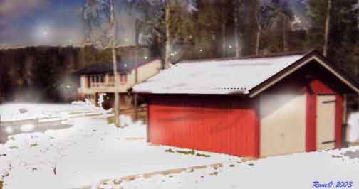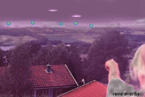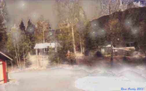 En natt i okt. 95? - våkner Liv av et forferdelig "leven" - og hun tror det er innbrudd i huset. Hun ser så at gangdøren er åpen og at det lyser der - hvilket det slett ikke "skulle". Hun lurte på hvordan tyvene var kommet inn men frykten gikk over til raseri. Ute i gangen så hun at kjellerdøren sto åpen - Liv forsto intet - "for jeg låser jo alltid". Hun hørte samtidig en merkelig summelyd. (Noe tilsvarende er beskrevet i SØREN B.s kontakter - han fikk også uanmeldt besøk på sitt soverom - se link til slutt). Men hun vil ta dem på fersken - går inn i sin stue - og der er alt på plass…..som vanlig. Intet er knust eller brutt opp og ødelagt, men så tenker hun at de må være i kjelleren... Men heller ingen der. Så ringer hun til lensmannen som ber henne se etter spor i nysnøen, det hadde nettopp snødd. Hun ser ut - men ser ingen spor! En betjent ankommer og de ser over hele huset - men intet unaturlig å se. Hadde det ikke vært for at disse dørene sto åpne, samt lysene på - ville hun tro det hele kunne vært en drøm i ettertid, men.... *** Den 12 okt 1997 – ca halv ni på kvelden - ser Liv flere lysende kuler over frostrøken som lå lavt over Randsfjorden, og etter å ha sett på dem en stund ringer hun til en nabo - Wenche Langbråten - som sammen med mannen og andre i huset - så det samme som referert under. Men før hun ringte sier Liv at en av kulene på et øyeblikk suste helt inn til hennes hus slik at hun på helt nært hold kunne se at det faktisk dreide seg om en "ufo" - med vinduer rundt det hele - men litt skuffet kunne hun ikke se noen vesener "der inne". Ja - hun sier hun kunne se gjennom hele skipet og ut på den andre siden gjennom vindusrekken i periferien av skipet…..det var et knallgult lys inne fra skipet (eller gule vegger…) sier Liv og merkelig tynne "vinduslister" mellom vinduene. Hun sier også på intervjuet at hun i ettertid fant ut at den må ha vært i en avstand på 18 meter fra huset. Hun går ut på terrassen og peker der månen sto på det aktuelle tidspunkt og hvor fartøyet var i forhold til noen trær som "den gang var en del mindre enn i dag". bildet er et forsøk på å gjenskape hennes (og to naboers-)opplevelse - her med Liv er ute på terassen og peker mot fartøyene - mens de små lyskulene "svirret" hit og dit med voldsom hastighet - noen ganger nede i tåka over Randsfjorden - og da skinte de i regnbuens farger. De to store var i ro over - men på et tidspunkt fløy det ene lynhurtig og plasserte seg rett utenfor vinduet til Liv - se bildet lenger ned. Da skipet for opp igjen sier hun det virket som et stort hjul og det blinket. Og hun ringte da til en journalist i lokalradioen - RANDSFJORDEN RUNDT (Bjørn Ivar Rudsengen) - som hun hadde lovt å kontakte "neste gang hun så noe" - og han + flere andre der - kunne se objektene. Se under. Tidlig på høsten -97 ble Liv "av noe" inspirert til å fortelle om alle sine merkelige opplevelser på denne lokalradioen og det ble et program på en hel time - som fikk så stor tilbakemelding i ettertid at det ble sendt i reprise senere. bildet: Liv peker og viser hvor nære fartøyet var og beskriver at det var merkelig at hun ikke så noen inne i skipet - bare det sterke gule lyset og de tynne lister mellom vinduene. Et spes. lys på venstre side la hun merke til. Det var dog mye mørkere under "møtet" og også en annen årstid. Bildemix av RuneØ Opplevelsen 4-8-00(som beskrives et sidetrykk lenger nede) var også med sterke LYS inne i den samme have som på bildet over - og noen trær var tydelig misfarvet etter fenomenets nærvær som hun også tok bilder av midt i forfjamselsen. Ja, da jeg besøkte liv for å gjøre dette intervjuet noen uker senere kunne jeg selv se misfargete trær- men kan ikke si de var direkte "brent" - men muligvis "bestrålet". Den 4.august 2000 - ca. kl.20.30 skulle Liv se noe på tv'n - men den virket ikke, og derfor ville hun hente et lite reise-tv på gjesterommet. (senere virket tv'n helt som vanlig). Der inne åpner hun gardinen og ser med ett noen merkelige lys utenfor huset! Det var jo enda ikke mørkt ute på denne tid av året. Først tror hun det er kvelds-solen, men innser at retningen er feil og fargen er jo "en slags stygg gulfarge" på den første lysskiven - flere med andre farger dukker opp etterhvert. Men hun har åndsnærværelse nok til å tenke på å ta noen bilder av lyskulene eller skivene som hun kaller dem - hun har et polaroidkamera liggende og med det tar hun bilder….et av bildene viser faktisk et sterkt lysende "noe". Det kan jo minne om et vanlig motlysbilde - med en "stygg" gulfarge slik hun selv bedømmer det. Senere ringer hun og sier hun har lagt merke til at det det også finnes to mindre "blomkållignende lys" over det området som i ettertiden var nærmest "svidd". Hun har også et annet polaroidbilde er av det lilla objektet som ble sterkt undereksponert av noen årsak hun ikke forstår.… Hun var sterkt oppskaket etter hendelen - noe jeg merket da hun nådde meg på mobiltelefonen noen dager senere. Hun hadde ellers forgjeves forsøkt å ringe mange hun kjente og også sol-observatoriet på Harestua som ligger i nærheten. Ingen hadde sett noe unaturlig denne dagen - så spørsmålet er om det var så lokalt at det faktisk bare "skjedde" rett utenfor som hun beskriver. Etter episoden oppdaget hun at et tre og noen busker var som svidd eller brent og hun ble selv "brent" i huden etter dette møtet forteller hun - ja, selv mener hun at noen av buskene i haven hennes som tydelig er misfarget - er blitt "radioaktive" som hun uttrykker det. Da intervjuet skjedde noen få uker etter hendelsen, var hun enda rød i huden - som hun da selv mener stammer fra dette merkelige møtet denne kvelden….Og buskene/trærne HADDE virkelig en merkelig gul misfarge sammenlignet med de omgivende havebusker.