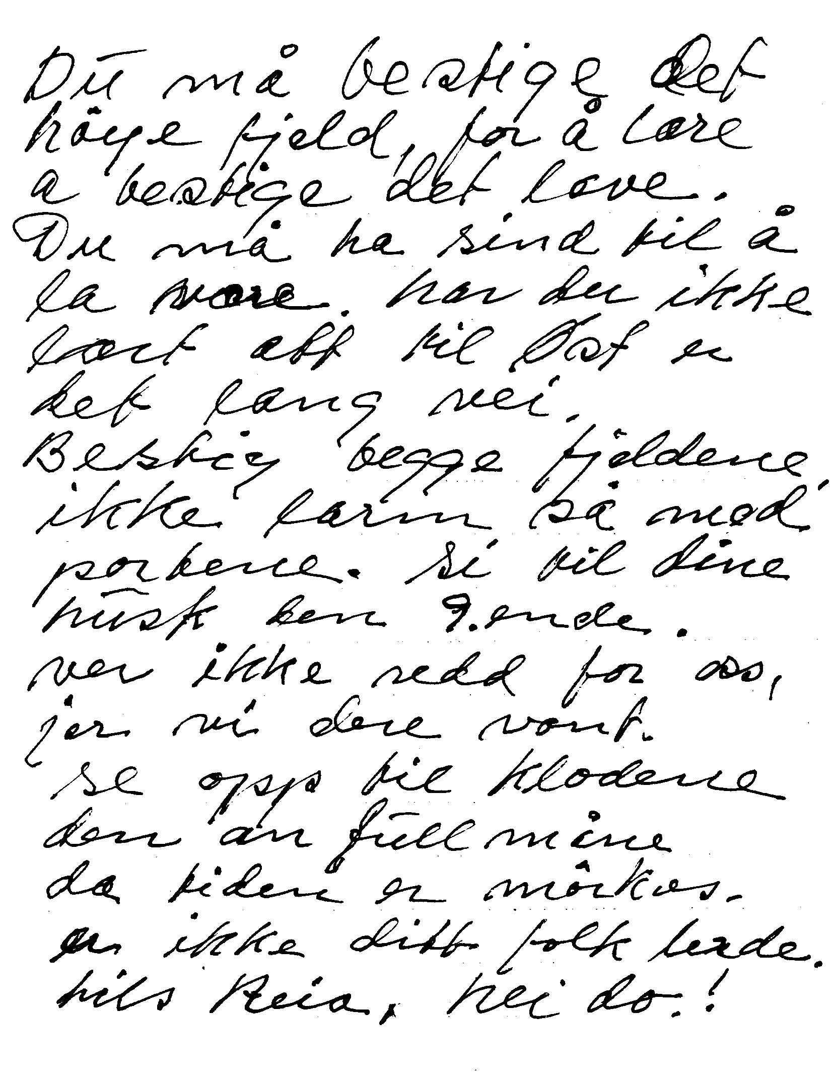 du må bestige det høye fjeld, for å lære å bestige det lave. Du må ha sind til å la være. har du ikke lært att til Øst er det lang vei. Bestig begge fjeldene, ikke larm så med portene. si til dine husk den 9.ende. ver ikke redd for oss, jer vi dere vont. se opp til klodene de an fullmåne da tiden er mørkes, er ikke ditt folk lerde. hils reia, hei do.! -------------------------------------------------- fotokopi av "brevlappen" innscannet. ------------------------------------------------- Ellers fikk Reidar si at spesielle ting/energier vil utløses den første delen av dette året 2001 - og at i siste halvdel av året ville "overvåkernes" skip fordobles rundt kloden - av noen bestemt årsak som jeg ikke skal spekulere i her - men R. mente at en stor "opprydding" var igang. Dette kan tolkes på flere måter - men de som kjenner "den kosmiske klokkes" plan for jorden, vet at vi i disse tider nettopp skal gjennom den følelsesmessige rensning - der etterhvert ALT AV NEGATIVE FØLELSER (hat, fiendeskap, sjalusi, osv. ) skal ut - tilgis og forløses. Derfor den sterke økning i bl.a. mentale forstyrrelser, selvmord, osv. i denne meget spesielle tid på jorden. ---------------------- en mulig "tydning" av noe av budskapet: det høye fjell - symbolikk for mennesket som et åndelig vesen - altså erkjennelsen at man er et evig, åndelig vesen i sin innerste og virkelige natur. Det lave fjell er de daglige "små" prøvelser - livet i hverdagen. "til øst" = der solen = symbolikk for det guddommelige - er det lang vei: det tar tid eller erfaring å nå fullkommen visdom. bestig begge fjeldene = både det åndelige og det fysisk/praktiske må beherskes.. "ikke larm med portene" = portene til det åndelige rom = visdommen må komme innenfra og det har ingen hensikt å lage "sirkus" rundt disse kosmiske sannheter - da de som sagt må erkjennes i den enkeltes indre. "de som har øyne - de ser...." **************** en onsdag ettermiddag sitter R. i bilen ikke langt fra sitt hjem da han på ei slette ser to fartøyer ca.200 m borte. Det ene er på bakken - det andre litt oppe i lufta. Rundt det på bakken er det noen personer - ca. 1,5 m høye - i tinnfargede drakter. Han ser gult lys i runde koøyer rundt om på skipene som var helt identiske. Han ser ikke noe understell.