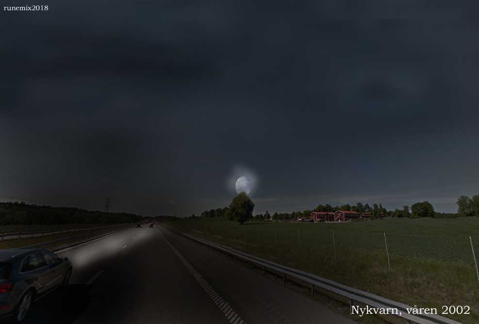 Nykvarn, v�ren 2002Den 24 augusti mottog rapportcentralen ett mejl av en kvinna som �tergav en egendomlig upplevelse som intr�ffade i mars eller april 2002. Kvinnan hade varit p� dans i Stockholmsomr�det och var p� v�g hem till sin d�varande bostad i �kers Styckebruk. Ungef�r n�r hon befann sig i h�jd med Nykvarn och nyligen hade passerat avtagsv�gen till Nykvarn fr�n E20 fick hon se vad hon uppfattade som ett gulaktigt klotliknande f�rem�l som hon j�mf�r med m�nen, strax �ver tr�den p� h�ger sida om v�gen (norrut). Kvinnan fortsatte l�ngs v�gen och kunde d� se f�rem�let vid sidan av v�gen under en tid medan hon f�rdades l�ngs en rakstr�cka utanf�r Nykvarn. D�refter f�rsvann f�rem�let hastigt och hon upplevde det som att f�rem�let slocknade eller helt pl�tsligt f�rsvann. �gonblicket efter att hon tappade bort f�rem�let vaknade observat�ren helt pl�tsligt upp vid en plats som hon kallar L�ggestabacken som ligger vid E20 sydv�st om Mariefred. Observa�t�ren var d� en aning f�rvirrad och viss�te f�rst inte var hon var men f�rstod s� sm�ningom att hon befann sig vid L�ggesta.