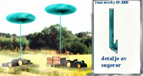 til venste på bildet sees en traktor og en skurtresker som på denne tiden ikke var bemannet, da det var matpause for mannskapet. Spesielt var at det fra fartøyene som sto over traktoren og treskeren hang ned noen "slanger" som i endene var utformet som trakter - SE BILDET UNDER- og Aksdal fikk den tanken at de sugde opp prøver fra kornet. Dette fordi slangene eller om det nå var et slags sugerør, sveipet rundt som en elefants snabel. Vitnet har også hatt andre ufo-opplevelser - se under