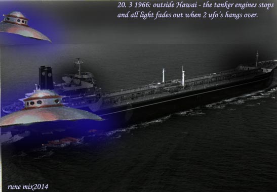 To svære diskosformede gjenstander står et par hundre meter fra akter på skipet. De er helt lydløse, men lyser ganske sterkt, som lyset fra en sveiselampe. Disse kjempediskosene har en diameter på rundt 30 meter, understellet går rundt, mens toppen står helt i ro. De to flygende tallerkenene glir langsomt over himmelen en stund før de forsvinner.