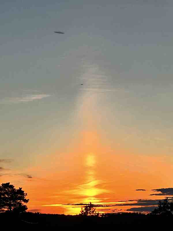 Etter en middag i byen «På brygga» dro vi hjem og satte oss på verandaen. Spennende skyer på himmelen denne kvelden. Noen store skybanker formet en massiv sky, og etterhvert dannet det seg et iøynefallende hull. Aud nevnte en observasjon hun hadde i Folldal.i sommer med om et mørkt «objekt» mot tordenskyene. Jeg ble mer interessert i å sjekke ut hullet i skyen, og gikk inn og hentet kikkerten. Satte meg ned og observerte, og der, på vei ut av hullet og mot oss så jeg to +-formede objekter. De fløy sammen, men på vei ut av hullet dro den ene oppover. Den andre fulgte jeg med kikkerten, og den bøyde av ned mot venstre og inn i en kraftig sving mot høyre. Den fortsatte i rett linje mot høyre, og var delvis inni og utenfor skyen.