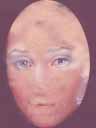 The alien being's nose was a small fleshy nub with no bridge structure. It had two nostrils like ours but they turned into the head in a different way. The ears were also small and not much more than a firm ridge but they didn't have any openings. The ear structure seemed to consist externally of a pair of membrane covered pits in the head. There was no jaw development and very little brow or cheekbone giving the head an almost melon-like appearance. The face muscles were also underdeveloped and the face had little mobility, giving the head a stern expressionless appearance. When asked about this later the being said that they had essentially overcome their emotional natures and there was little of that nature to be expressed in the face. The eyes were the center of attention in the face and they seemed to be very alive. They seem to flash and the image is very intense.