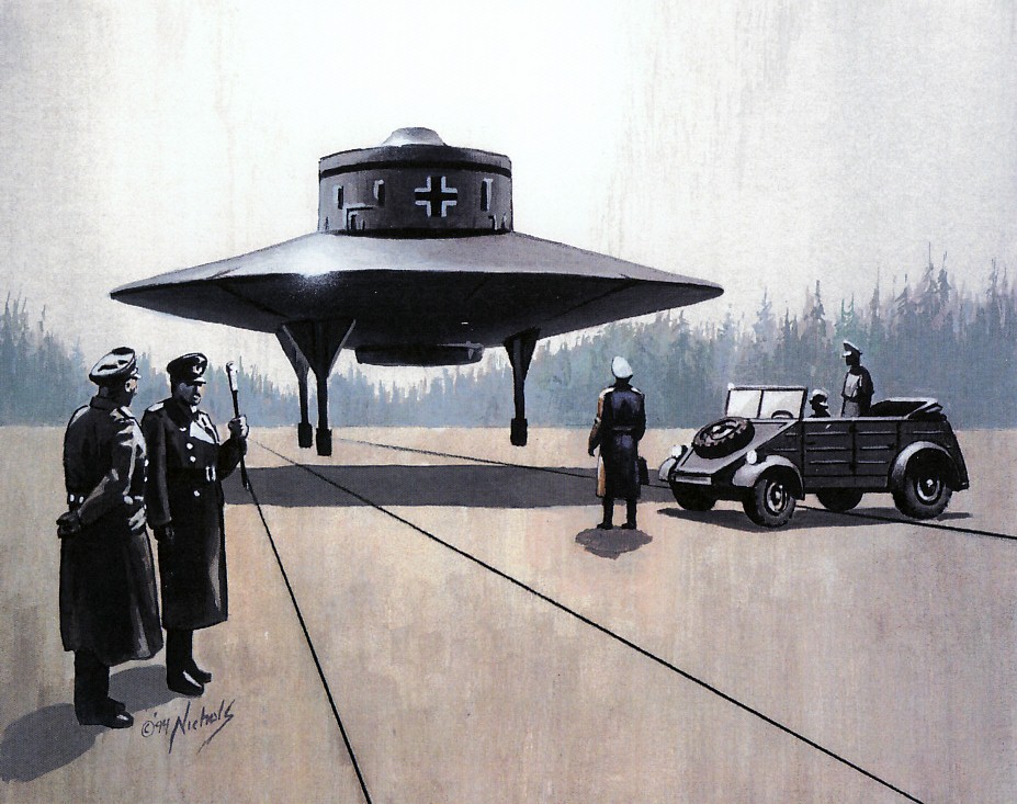 «På slutten av krigen hadde nazistene ni hemmelige forskningsanlegg, hvor de bygget to typer disker: det minste «Vril»-fartøyet, og den mye større «Haunebu». Begge disse ble drevet ved hjelp av et «null-gravitasjonsfelt». I test-flyvninger steg disse fartøyene 60.000 fot på kun seks og et halvt minutt, hvilket radikalt overgikk hva de alliertes fly kunne utføre.» Så merkelig det enn høres, så påstår Stevens at disse fartøyene ble brukt kun en gang mot de allierte, der de uten sidestykke fullstendig utmanøvrerte et bombeflyraid på 800 fly over Tyskland, og skjøt ned 200 bombefly i løpet av en natt. Men tilsynelatende hadde utviklingen kommet for sent til å redde Det tredje riket, og nazistene besluttet at det var bedre å forsøke å benytte denne teknologien etter krigen, i et forsøk på å etablere et Fjerde rike. Stevens mener at på tross av usedvanlige forsiktighetsregler fra nazistenes side, gjennom å ødelegge både forskningsanlegg og alle eksisterende bevis, så klarte både russerne og amerikanerne å kapre både arbeidstegninger og nok vitenskapsmenn til å grunnlegge sine egne flyvende diskos-program. Jordiske UFOer Gitt betydelige bevis for at visse grener innenfor regjeringen i hemmelighet har bygget flygende diskos-formede fartøy, blir spørsmålet hvor mange UFO-observasjoner verden rundt er utenomjordiske, og hvor mange representerer vår egen oppfinnsomhet? Stevens mening om dette temaet ble endret etter private samtaler med Stan Deyo - en «skyggefigur» som påstår å være ledende konsulent i området- gravitasjonsbaserte fremdriftssystemer. "Jeg møtte Deyo første gang da han kom til Laughlin-konferansen for å holde foredrag," forklarer Stevens. "Han er en meget suksessfull forsker innen utvikling og konstruksjon av gravitasjonsbaserte fremdrifts- systemer, og arbeider for den amerikanske regjeringen som konsulent på ulike steder, inkludert den notoriske basen i Pine Gap, Australia." Her mener Stevens at både England, Frankrike, Vest Tyskland og USA deler en hemmelig base, for å bygge og teste denne fantastiske UFO teknologien. "Jeg var målløs da Deyo informerte meg om at han var sikker på at rundt 40% av alle UFO-observasjoner kan tilskrives jordisk produserte fartøyer, og er observert av uinformerte vitner. Han påsto at USA hadde ett funksjonelt fartøy av denne typen allerede så tidlig som i 1958, og fløy kaprede tyske disker før den tid. Jeg spurte Deyo hvordan de kunne holde noe som dette skjult så lenge, og han svarte at for det første hadde autoritetene som var ansvarlige for disse programmene sin en egen kommandolinje - de var ikke ansvarlig overfor noen, unntatt seg selv. For det andre, var alle de ansatte karrierepersoner, og bokstavelig talt ansatt i jobben på livstid. Denne jobben var ikke noe du kunne forlate. For det tredje var incentivene uhyre store, og straffen var permanent."