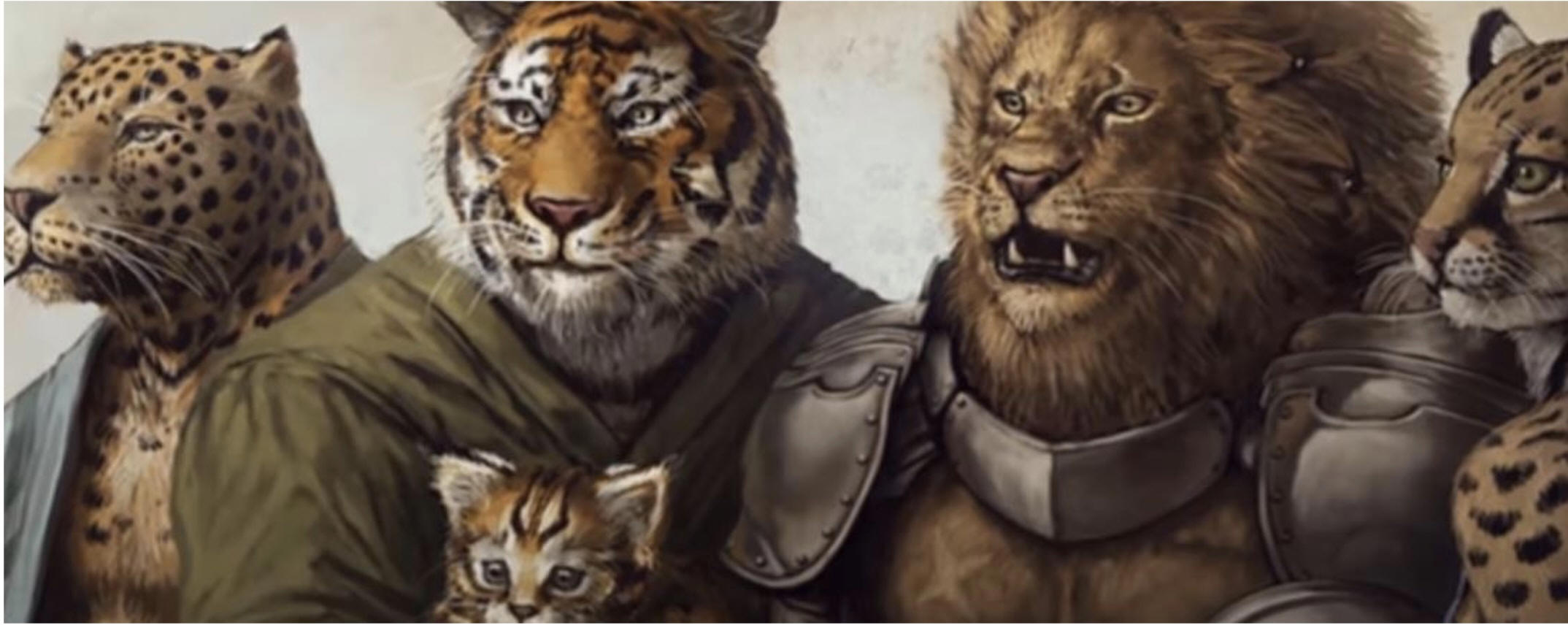The Urmah are like lions or tigers. However, as on Earth, there are subspecies. That is, they are not all lions, but they are all like big cats. All mixed, and they do create offspring among themselves. Not all of them have stripes like a tiger, but let's say most of them do have stripes all over their bodies. It's just that as they dress you don't notice them other than on their face, arms or hands. I see stripes more commonly on brindles, hence the yellow lion, but even on those I see stripes sometimes. The vintage cartoon "Thundercats" are clearly allusive to the Urmah.